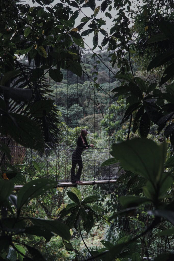 There are a total of 15 bridges, 6 of which are hanging suspension bridges. Each one takes you to a different vertical level of the rainforest — the higher bridges are surrounded by howler monkey and toucan territory, while the lower bridges become cooler, more humid, and quiet.